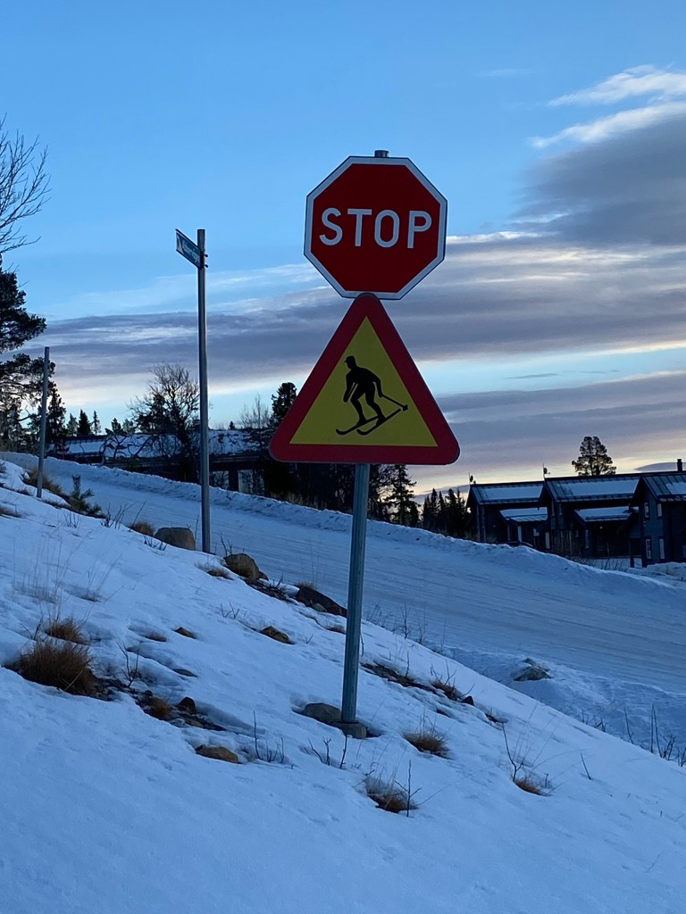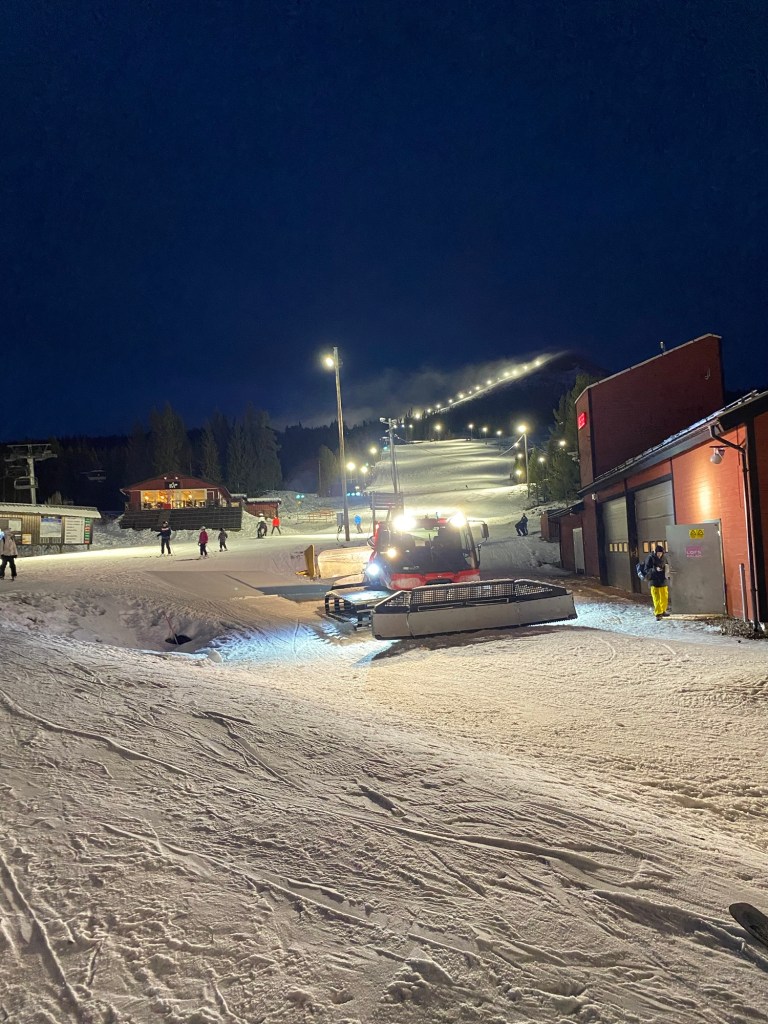 ”En av de vackra och upplysta skidbackarna, lockade många skidåkare i alla åldrar… Vi åkte inte skidor…men pulka, promenader och andra upptäcksfärder stod på programmet…!””Varning för utförsåkare…inte de vanliga vägskyltarna direkt…! Då är det bara att slänga sig åt sidan…på direkten…!”😂